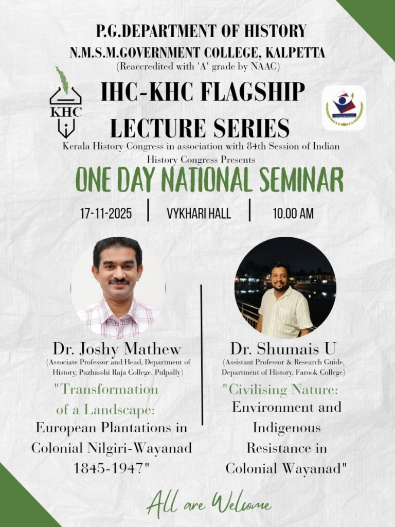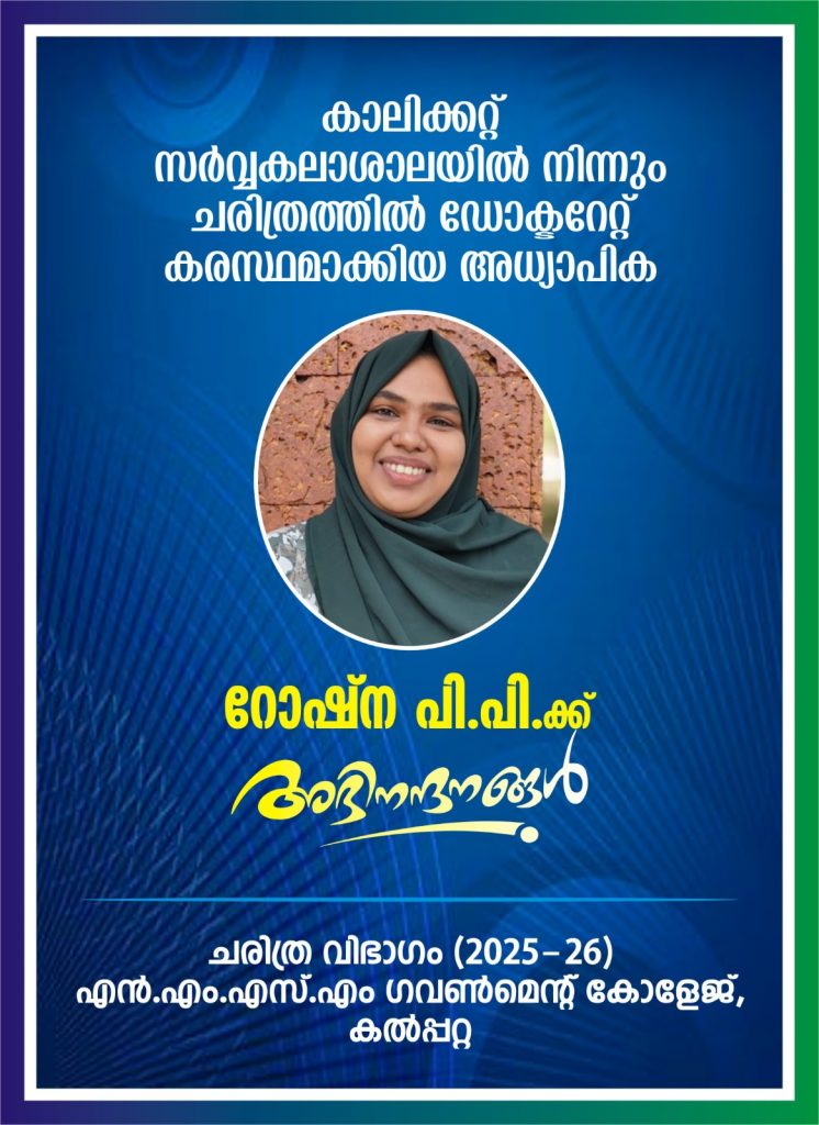 SyllabusThe Department of History was established at N.M.S.M. Government College Kalpetta in 1989 as an undergraduate Department. It was upgraded to a Post Graduate Department in 2020. Currently, it offers BA in History and MA in History (Elective: World History). The course intake for the B.A. program is 70, and for the M.A. program, it is 20 students.